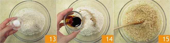 Geben Sie den Reis in eine Schüssel und würzen Sie ihn mit Salz 13, dunkler und heller Sojasauce 14. Gut mischen und beiseite stellen 15.
