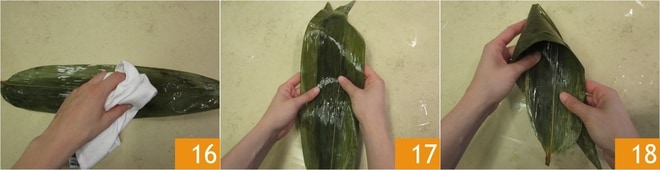 Nach der Einweichzeit spülen Sie die Bambusblätter unter fließendem Wasser ab, reinigen Sie sie dann mit einem Tuch von beiden Seiten, um Verunreinigungen zu entfernen 16. Legen Sie leicht zwei Blätter übereinander 17, falten Sie sie dann zu einer Art Kegel, der auf einer Seite offen ist 18.