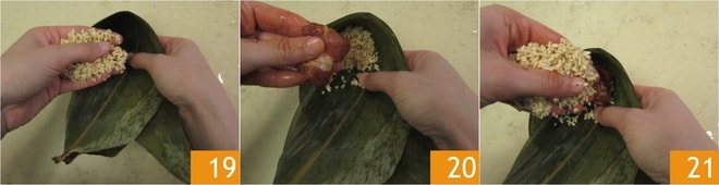Halten Sie den so geformten Kegel in der Handfläche und geben Sie eine kleine Handvoll Reis hinein 19, dann 2 oder 3 Fleischstücke dazu 20 und bedecken Sie mit mehr Reis 21; der Reis an der Basis sollte etwa ein Drittel der gesamten Füllung jedes Zongzi betragen.