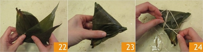 Falten Sie die Enden der Blätter 22 so, dass eine dreieckige Form entsteht 23, und schließen Sie, indem Sie das Päckchen mit mehreren Umdrehungen Küchengarn umwickeln 24. Machen Sie weiter, bis die Zutaten aufgebraucht sind; mit diesen Mengen erhalten Sie 20 Stück. Zur Erleichterung können Sie die Enden des Garns von 4-5 Zongzi zusammenbinden, sodass sie leichter abtropfen können.