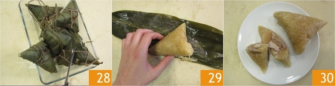 Entfernen Sie das Garn 28 und öffnen Sie die Bambusblätter vorsichtig 29. Ihre Zongzi sind bereit, genossen zu werden 30!
