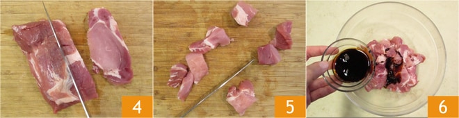 Schneiden Sie das Fleisch in etwa 2 cm dicke Scheiben 4 und schneiden Sie kleine Stücke heraus 5. Geben Sie sie in eine Schüssel und würzen Sie mit heller und dunkler Sojasauce 6.