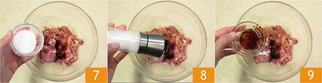 Fügen Sie auch den Zucker 7, das Salz 8, den Pfeffer und den Reiswein 9 hinzu.