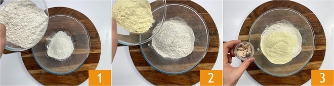 Um den Zopf mit Pesto und Kirschtomaten vorzubereiten, beginnen Sie mit dem Teig. Geben Sie das Mehl 1, den Grieß 2 und die zerbröckelte Hefe 3 in eine Schüssel.