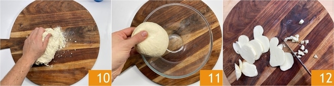 Übertragen Sie ihn dann auf eine Arbeitsfläche 10 und kneten Sie weiter, bis Sie einen glatten und homogenen Teig erhalten 11. Decken Sie ihn mit Frischhaltefolie ab und lassen Sie ihn etwa 2,5 Stunden gehen, bis sich das Volumen verdoppelt hat. Schneiden Sie ein paar Minuten vor dem Ende den Scamorza in Würfel 12.