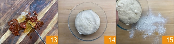Schneiden Sie auch die gut abgetropften Kirschtomaten in Stücke 13. Sobald der Teig gut gegangen ist 14, übertragen Sie ihn auf eine leicht bemehlte Arbeitsfläche 15.