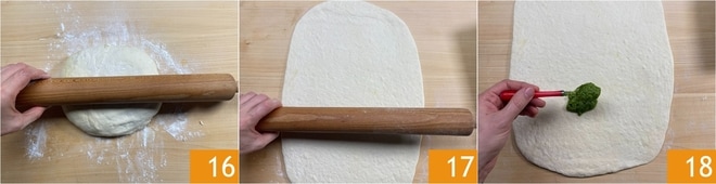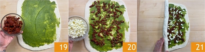 Bemehlen Sie auch den Teig ein wenig 16 und rollen Sie ihn aus, bis Sie ein Rechteck mit einer Dicke von 1 cm erhalten 17. Geben Sie das Pesto auf den Teig 18 und verteilen Sie es, sodass es fast die gesamte Oberfläche bedeckt 18.