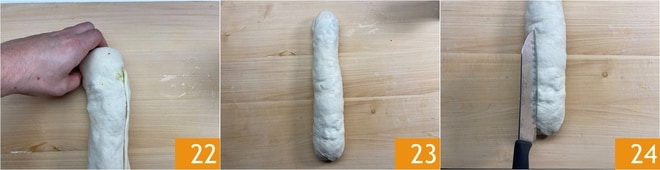 Dann versiegeln Sie die Enden gut 22, um eine Rolle zu erhalten 23. Schneiden Sie diese in der Mitte entlang der gesamten Länge 24.