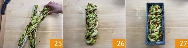 Überlagern Sie die beiden Teile 25 und drehen Sie sie, bis Sie einen Zopf erhalten 26. Legen Sie diesen in eine Kastenform von 25x12 cm, die mit Backpapier ausgelegt ist 27.