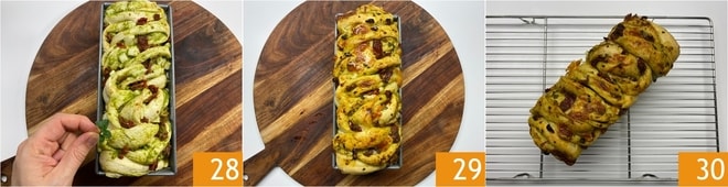 Lassen Sie ihn noch eine Stunde gehen, streuen Sie dann die Salzflocken und die Oregano-Blätter darüber 28. Backen Sie im vorgeheizten statischen Ofen bei 180°, bis er schön goldbraun ist. Nehmen Sie den Zopf dann aus dem Ofen 29, warten Sie ein paar Minuten und übertragen Sie ihn auf ein Gitter 30. Lassen Sie ihn abkühlen und servieren Sie ihn 30.