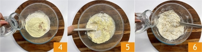 Fügen Sie einen Teil des Wassers hinzu 4 und beginnen Sie mit einem Löffel zu mischen 5. Fügen Sie dann noch mehr Wasser hinzu 6 und mischen Sie.