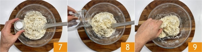 Fügen Sie zum Schluss das Salz 7 und das restliche Wasser 8 hinzu. Kneten Sie den Teig mit den Händen in der Schüssel 9.