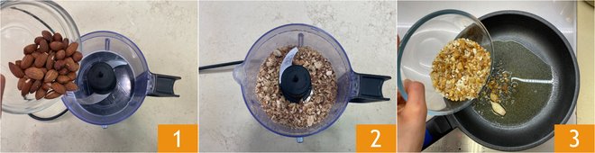 Um die Zucchini-Kartoffel-Cremesuppe zuzubereiten, geben Sie zuerst die Mandeln 1 in einen Mixer und zerkleinern Sie sie grob 2. Geben Sie in einer Pfanne das Öl und den Knoblauch hinzu und lassen Sie es einige Minuten ziehen. Fügen Sie die Semmelbrösel hinzu 3 und rösten Sie sie bei mittlerer Hitze goldbraun.