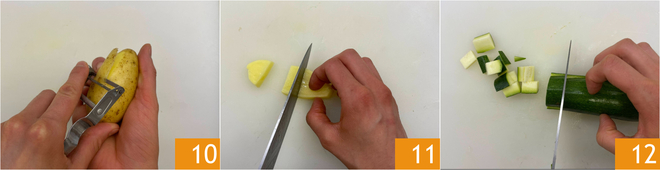 Schälen Sie die Kartoffeln 10 und schneiden Sie sie zuerst in Scheiben und dann in etwa 1 cm große Würfel 11. Schneiden Sie die Enden der Zucchini ab und schneiden Sie sie ebenfalls in Scheiben und dann in Würfel 12.