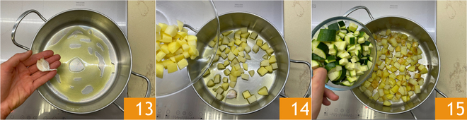 Geben Sie in einen Topf Öl und Knoblauch 13, erhitzen Sie es einige Minuten, dann fügen Sie die Kartoffeln hinzu 14 und braten Sie sie 10 Minuten an. An diesem Punkt die Zucchini hinzufügen 15.