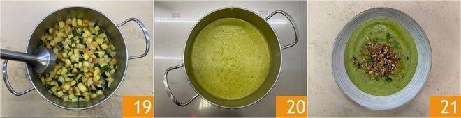 Mixen Sie alles mit einem Stabmixer 19, um eine cremige Konsistenz zu erhalten 20. Servieren Sie und garnieren Sie mit den Semmelbröseln und Mandeln. Die Zucchini-Kartoffel-Cremesuppe ist bereit, genossen zu werden 21!
