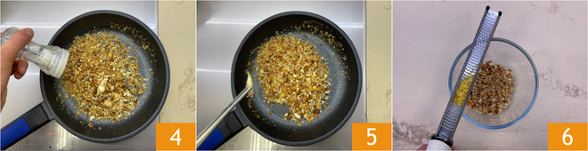 Salzen Sie 4, entfernen Sie den Knoblauch 5 und geben Sie alles in eine Schüssel, dann lassen Sie es abkühlen. Aromatisieren Sie die Semmelbrösel mit Zitronenschale 6.
