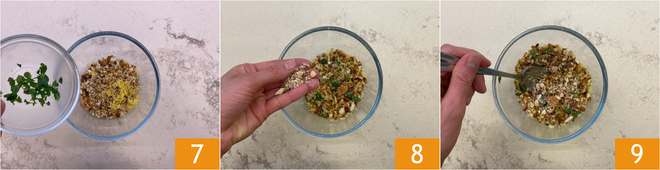 Fügen Sie auch die Minzblätter 7 und die Mandeln 8 hinzu und mischen Sie 9.