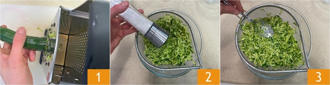 Für die Zubereitung des Zucchini-Mandel-Pestos zuerst die Zucchini waschen und die Enden entfernen, dann mit einer groben Reibe raspeln 1. Die Zucchiniraspel in ein Sieb geben, salzen 2 und mit einem Löffel leicht ausdrücken. Die Zucchini 20 Minuten ruhen lassen, damit die Flüssigkeit abtropfen kann 3.