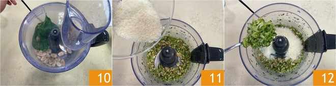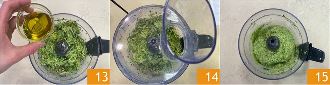 Pürieren 10, bis eine grobe Konsistenz erreicht ist. Nun den frisch geriebenen Parmigiano Reggiano 11 und die abgetropften Zucchini 12 unterrühren.