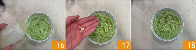 Vervollständigen Sie das Pesto mit einem Schuss natives Olivenöl extra 16 und den beiseitegelegten Mandeln 17. Ihr Zucchini-Mandel-Pesto ist servierfertig 18!