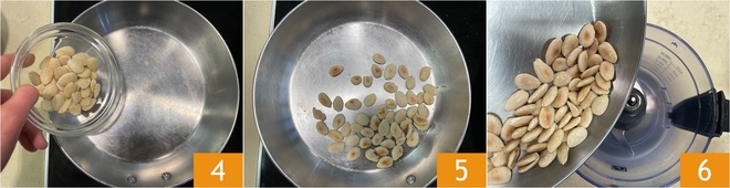 In der Zwischenzeit die geschälten Mandeln in einer heißen Pfanne 4 bei mittlerer Hitze etwa 7 Minuten rösten, dabei häufig umrühren, damit sie nicht verbrennen 5. Die gerösteten Mandeln in einen Mixer mit Messern geben 6 und einige Mandeln für die Dekoration beiseitelegen.