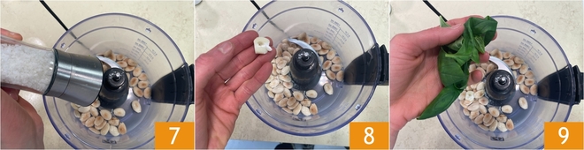 Salz hinzufügen 7, die geschälte und vom Keim befreite Knoblauchzehe 8 und frischen Basilikum 9 dazugeben.