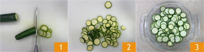 Um das Zucchini-Omelett in der Mikrowelle zuzubereiten, schneiden Sie zuerst die Zucchini in feine Scheiben von etwa 3 mm Dicke 1 2. Legen Sie die Zucchini in eine runde mikrowellengeeignete Form von 20 cm Durchmesser 3.
