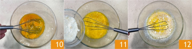 Schlagen Sie energisch mit einem Schneebesen oder einer Gabel 10, dann fügen Sie den geriebenen Grana Padano DOP hinzu 11 und mischen Sie ein letztes Mal 12.