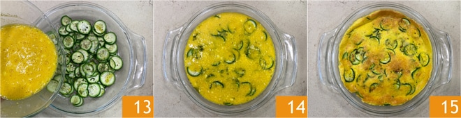 Gießen Sie die Eier in die Form mit den Zucchini 13 und kochen Sie bei 650 W für 3 Minuten, dann wechseln Sie zur Grillfunktion und kochen Sie weitere 3 Minuten 14. Das Zucchini-Omelett in der Mikrowelle ist bereit zum Servieren 15!