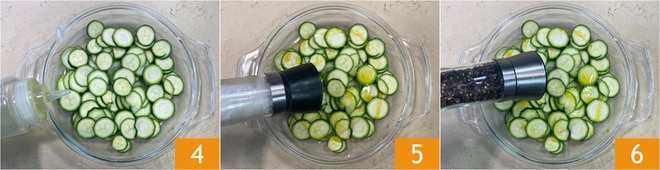 Würzen Sie mit Öl 4, Salz 5 und Pfeffer 6.