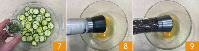 Fügen Sie den Thymian hinzu 7 und kochen Sie bei 650 W für 3 Minuten in der Mikrowelle. In der Zwischenzeit schlagen Sie in einer Schüssel die Eier auf, würzen Sie mit Salz 8 und Pfeffer 9.
