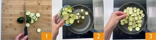 Um die herzhafte Zucchini-Ricotta-Torte zuzubereiten, waschen und schneiden Sie zuerst die Zucchini in ziemlich dünne Scheiben 1. Versuchen Sie, eine Dicke von 2-3 mm zu erreichen. Geben Sie einen Schuss Öl in eine Pfanne und fügen Sie eine zerdrückte ungeschälte Knoblauchzehe hinzu. Lassen Sie es einige Minuten köcheln, dann fügen Sie die Zucchini hinzu 2. Verwenden Sie eine große Pfanne, damit die meisten Zucchini nicht übereinander liegen. Salzen Sie 3 und kochen Sie bei mittlerer Hitze.