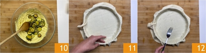 Mischen Sie mit einem Holzlöffel 10. Rollen Sie den Blätterteig vorsichtig aus. Legen Sie ihn in eine Tortenform, vorzugsweise mit abnehmbarem Boden, mit einem Durchmesser von 24 cm. Achten Sie darauf, die Ränder gut anzudrücken, lassen Sie den Überschuss überstehen 11. Stechen Sie den Boden mit den Zinken einer Gabel ein 12.