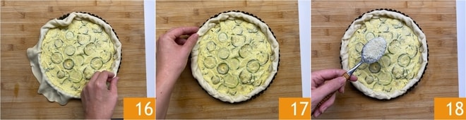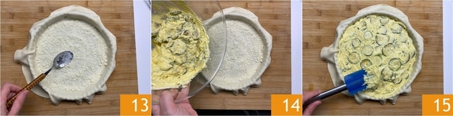 Bestreuen Sie den Boden mit dem restlichen geriebenen Grana 13, das wird helfen, den Boden zu isolieren und zu verhindern, dass er beim Backen feucht wird. Jetzt geben Sie die Füllung hinein 14 und glätten sie mit einem Spatel 15.