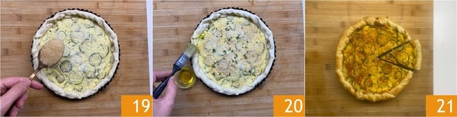 Bestreuen Sie auch mit einer Schicht Semmelbrösel 19 für eine super goldene Kruste, und mehr Thymian. Geben Sie einen großzügigen Esslöffel Öl in eine kleine Schüssel und tauchen Sie den Pinsel hinein. Bestreichen Sie damit den ganzen Rand 20. Träufeln Sie das restliche Öl (auf dem Pinsel und in der Schale) auch auf den Rest der Torte. Backen Sie sie in einem statischen Ofen bei 200° für 35-40 Minuten. Lösen Sie sie vorsichtig aus, nachdem Sie sie abkühlen lassen haben, und servieren Sie sie 21.