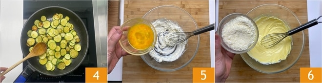 Kochen Sie 8-10 Minuten, ohne zu viel zu rühren, bis die Zucchini zart, aber leicht gebräunt sind 4. Entfernen Sie den Knoblauch, stellen Sie ihn beiseite und lassen Sie ihn abkühlen. In der Zwischenzeit arbeiten Sie den Ricotta in einer Schüssel mit einem Schneebesen. Fügen Sie die Eier 5 und den geriebenen Grana Padano hinzu, wobei Sie etwas davon beiseitelegen 6.
