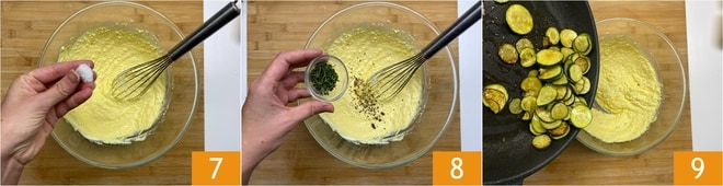 Fügen Sie eine Prise Salz 7, einen Hauch Pfeffer und den Thymian hinzu 8. Rühren Sie gut mit dem Schneebesen, dann fügen Sie die mittlerweile abgekühlten Zucchini hinzu 9.