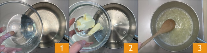 Um die Zucchini-Tartelettes herzustellen, bereiten Sie zuerst den Teig für die Basis vor: Gießen Sie Wasser 1 und Butter 2 in einen kleinen Topf, dann zum Kochen bringen 3.