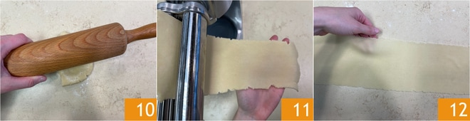 Nach dieser Zeit rollen Sie den Teig leicht mit einem Nudelholz aus 10, dann durch die Walzen der Nudelmaschine ziehen, wobei Sie die Dicke nach und nach reduzieren 11. Sie sollten einen Teig mit einer Dicke von etwa 3 mm erhalten 12.