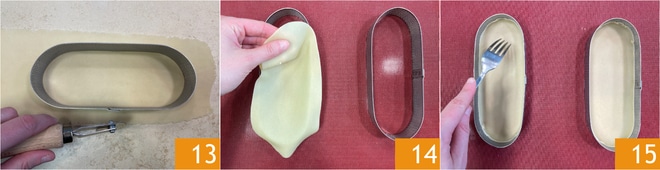 Legen Sie einen ovalen Ausstecher auf den Teig, der etwa 19 cm lang, 7 cm breit und 3,5 cm hoch ist, und schneiden Sie ihn mit einem Teigrädchen aus, wobei Sie etwa 2 cm vom Rand entfernt bleiben 13. Platzieren Sie den Ausstecher auf ein mit Backpapier oder Silpat ausgelegtes Blech und geben Sie den ausgeschnittenen Teig hinein 14, drücken Sie ihn gut gegen die Ränder, damit er haftet. Stechen Sie den Boden mit einer Gabel ein 15 und backen Sie ihn im vorgeheizten statischen Ofen bei 170° für etwa 20 Minuten. Sobald die Tartelettes goldbraun sind, aus dem Ofen nehmen und abkühlen lassen.
