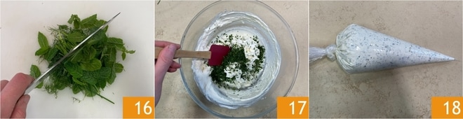 In der Zwischenzeit die Ricottacreme vorbereiten: Die Kräuter fein hacken 16, dann zur Ricotta hinzufügen, die Sie in einer Schüssel mit der Sahne vermischt haben 17. Mit Öl, Salz und Pfeffer würzen. Die erhaltene Creme in einen Spritzbeutel ohne Tülle geben und bis zur Verwendung im Kühlschrank aufbewahren 18.