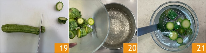Jetzt waschen und schneiden Sie die Enden der Zucchini ab 19. Blanchieren Sie die Enden der Zucchini für ein paar Minuten 20, dann abtropfen lassen und in eine Schüssel mit Eiswasser geben 21.
