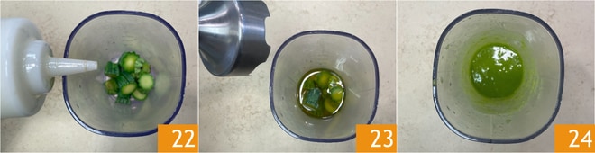 Die blanchierten Zucchini in einen Mixbecher zusammen mit 100 g Öl geben 22, dann mit einem Stabmixer pürieren 23, um sie zu einer Creme zu verarbeiten 24.