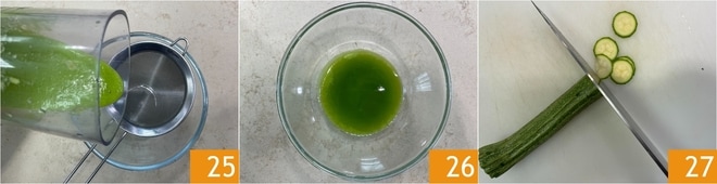 Die Creme durch ein feines Sieb filtern 25 und das erhaltene Zucchiniöl aufbewahren 26. Den Rest der Zucchini in dünne Scheiben schneiden 27.