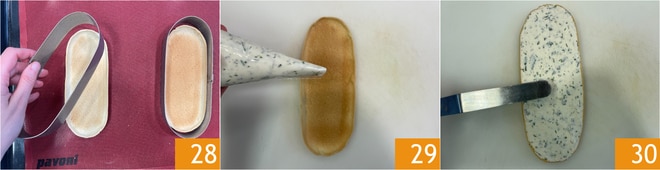 Zu diesem Zeitpunkt sind die Tartelettes abgekühlt, daher den Ausstecher vorsichtig entfernen 28. Die Basis mit der Ricottacreme füllen 29 und die Oberfläche mit einem Spatel glätten 30.
