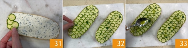 Mit den rohen Zucchinischeiben 31 und ein paar Kräutern 32 garnieren, dann mit dem Zucchiniöl würzen 33. Ihre Zucchini-Tartelettes sind bereit zum Servieren!