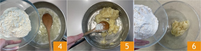 Fügen Sie 75 g Mehl hinzu 4 und rühren Sie gut auf dem Herd, bis sich auf dem Boden eine Schicht bildet 5. An diesem Punkt den Teig in eine Schüssel geben und die restlichen 150 g Mehl nach und nach hinzufügen 6, dabei können Sie auch eine Küchenmaschine mit einem Flachrührer verwenden.