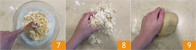 Inkorporieren Sie das Mehl nach und nach, indem Sie zuerst mit einem Löffel in der Schüssel 7 und dann mit den Händen auf der Arbeitsfläche arbeiten 8. Sobald Sie einen glatten und homogenen Teig erhalten haben 9, wickeln Sie ihn in Frischhaltefolie und lassen ihn etwa 30 Minuten im Kühlschrank ruhen.