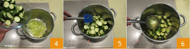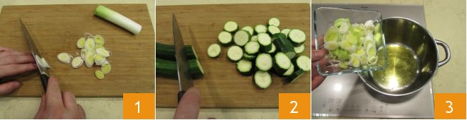 Um die Zucchinisuppe zuzubereiten, beginnen Sie als Erstes mit der Herstellung der Gemüsebrühe. Sobald diese fertig ist, kümmern Sie sich um den Lauch: Entfernen Sie die Enden und behalten Sie nur den mittleren Teil, entfernen Sie die oberste Schicht und schneiden Sie ihn fein 1. Waschen und putzen Sie dann die Zucchini, schneiden Sie sie in Scheiben 2. Geben Sie das Öl in einen Topf, lassen Sie es erhitzen und fügen Sie die Lauchscheiben hinzu 3;